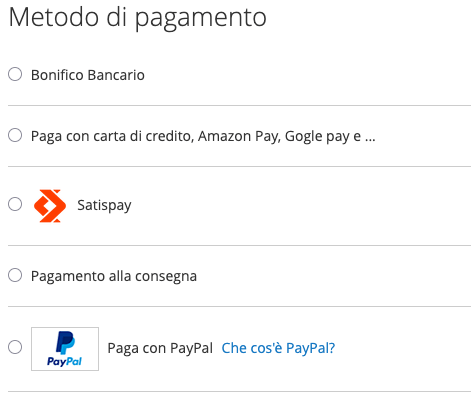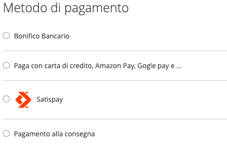 Scegliendo di pagare con Satispay basterà spuntare la scelta satispay nella sezione pagamenti e scansionare con l'app sul tuo smartphone il QR code generato.