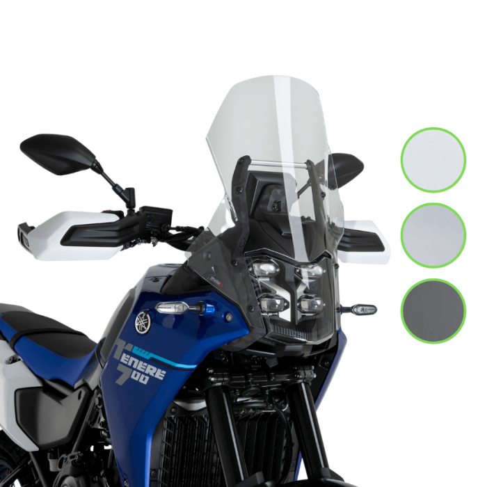 Cupolino Puig serie Touring 22515 in PMMA con omologazioni ABE e TUV per la moto Yamaha Tenerè 700 dal 2025. Il cupolino Puig 22515 Touring è disponibile in trasparente 22515W, fumè chiaro 22515H e fumè scuro 22515F.
