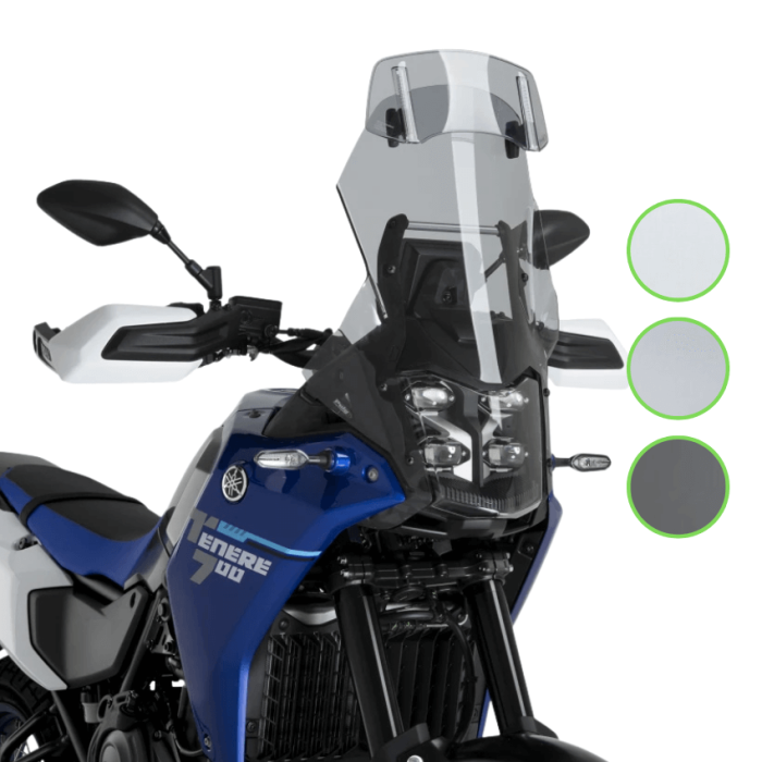Cupolino Puig 22516 serie Touring con visore superiore regolabile per la moto Yamaha Tenerè 700 dal 2025. Il cupolino, omologato TUV e ABE è acquistabile in tre differenti colorazioni: trasparente 22516W, fumè chiaro 22516H e fumè scuro 22516F.