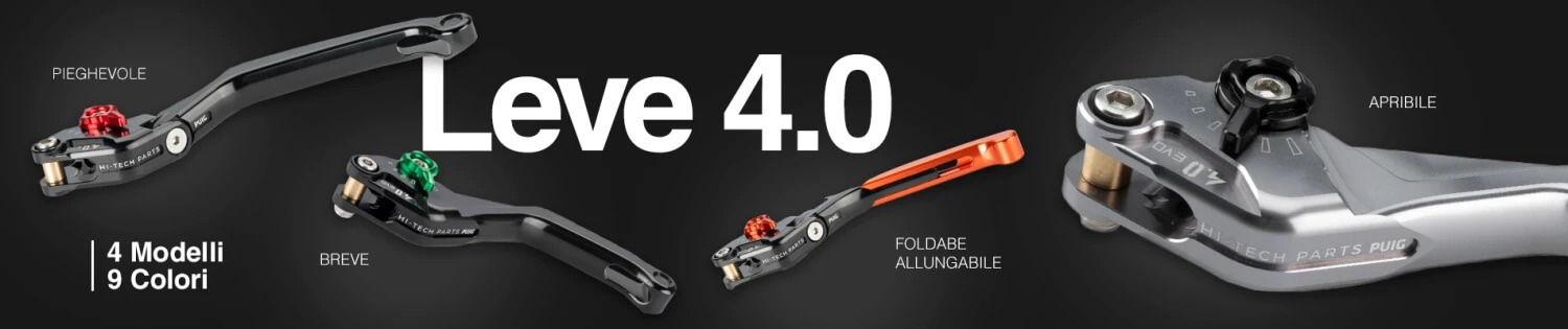 Coppia di leve moto freno e frizione Puig 4.0 ricavate da un pezzo unico di alluminio con finitura anodizzata. Le leve Puig 4.0 possono essere acquistate in differenti colorazioni sia della leva stessa che del selettore. Le leve Puig 4.0 sono disponibili nella versione fissa, corta, pieghevole o estensibile.